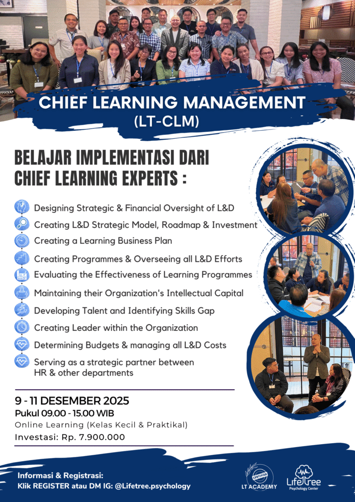 Program yang dirancang khusus untuk sahabat LT yang ingin mengenal dan memperdalam konsep, aplikasi dan strategi manajemen sebagai seorang Chief Learning di organisasi praktis. Program ini akan membagikan prinsip – prinsip fundamental sebagai CLM sekaligus bestpractices yang dilakukan di industri praktis dunia pembelajaran.