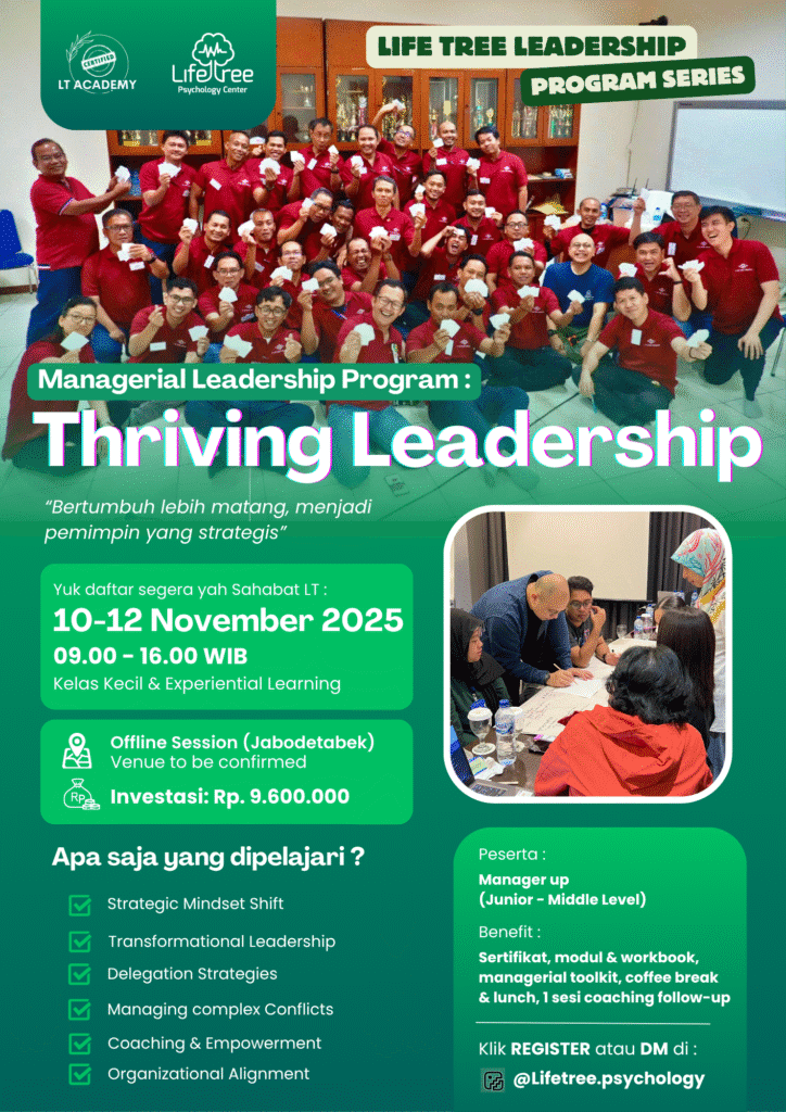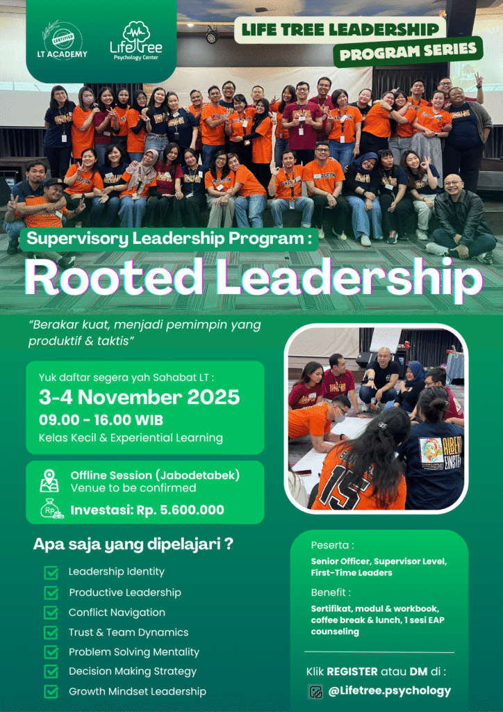 Program yang dirancang untuk mempelajari dan mengasah kemampuan supervisor atau leader pemula untuk melewati transisi menjadi seorang leader yang berakar kuat, menjadi pemimpin yang produktif, bisa membangun trust dan mampu mengelola tim dengan mengenal dan menerapkan pendekatan psikologi organisasi serta prinsip leadership secara praktikal. Program ini akan disajikan dengan fundamental yang kuat di level taktikal disertai implementasi praktis sebagai leader di level supervisor / first-time leaders.