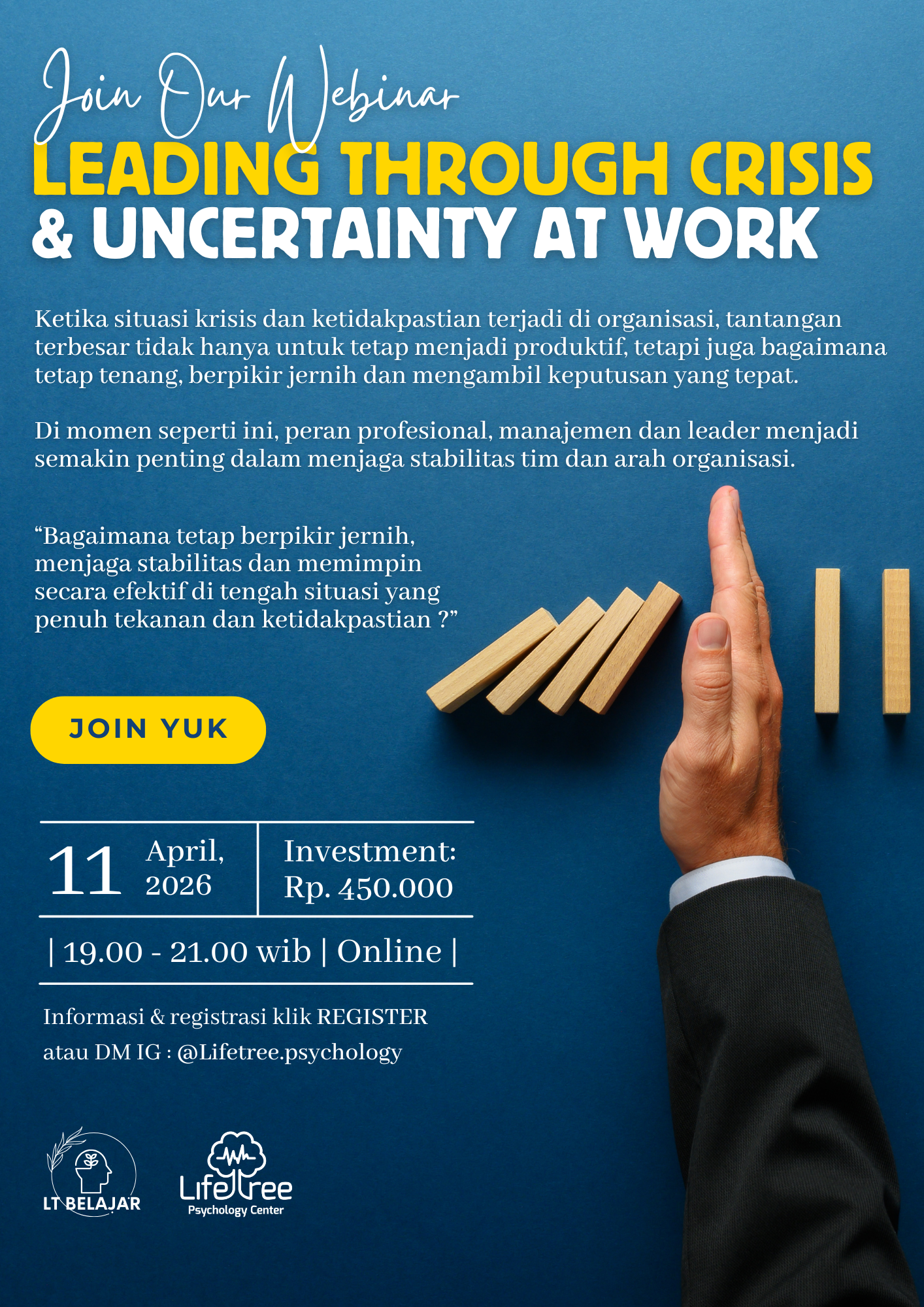Program belajar yang berfokus pada cara-cara efektif dan produktif dalam mengelola potensi resiko dan menerapkan manajemen stres. Sahabat LT bisa mempelajari bagaimana mengenal sumber tekanan, bagaimana stres terjadi di dalam diri maupun organisasi serta bagaimana mengendalikan sumber tekanan yang muncul menjadi tindakan yang produktif dalam kehidupan profesional maupun sehari-hari LT.